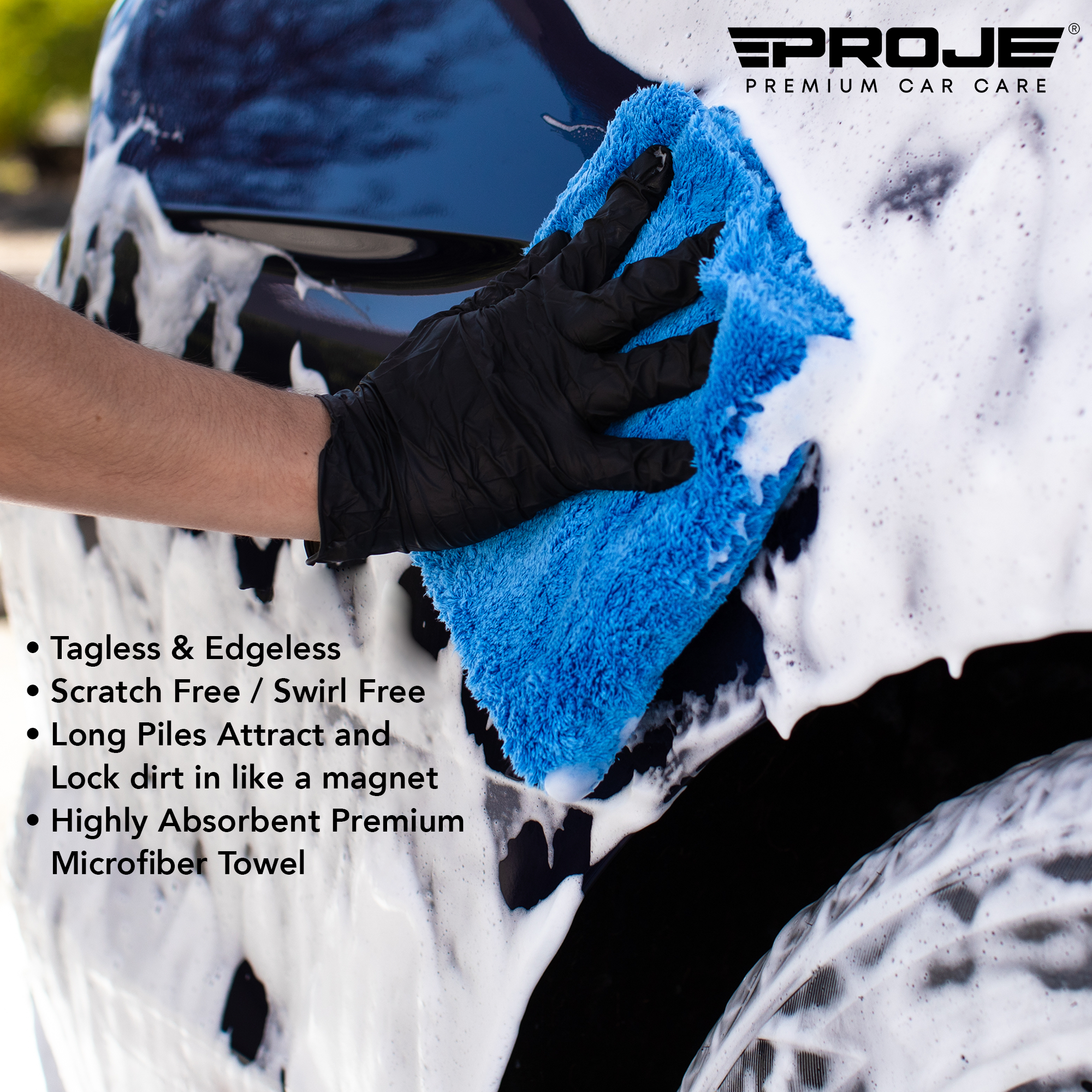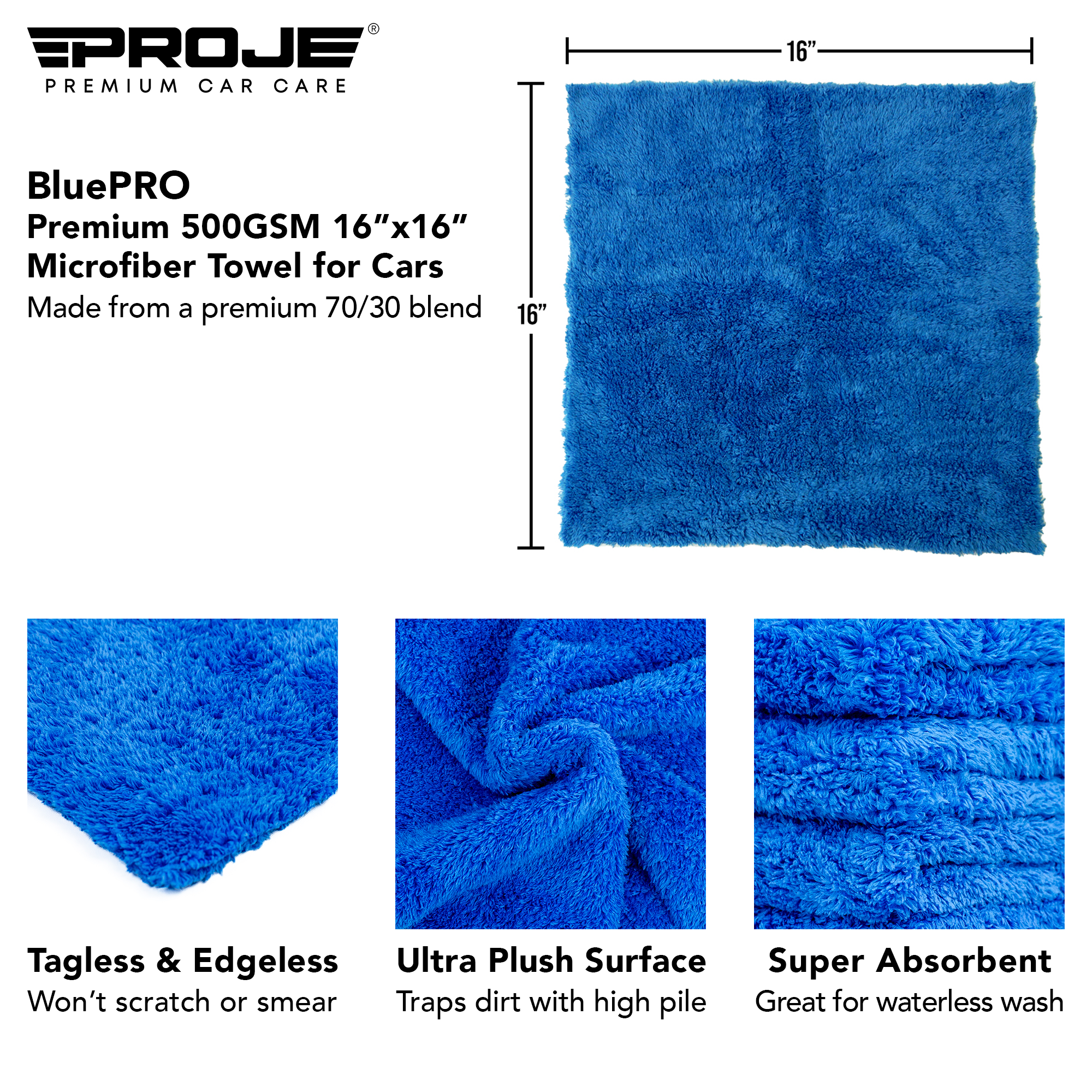 Introducing Proje's professional grade BluePRO microfiber towels. With a premium rating of 500 GSM (Grams Per Square Meter), these towels are plush, soft, and super absorbent! The long microfiber piles are perfect to quickly and easily remove residues like detailing sprays, waxes, compounds, and sealants. What's more, these towels can be used to clean and shine a variety of surfaces, including musical instruments, monitors and much more. With a durability of up to 500 wash cycles, these towels are built to last.