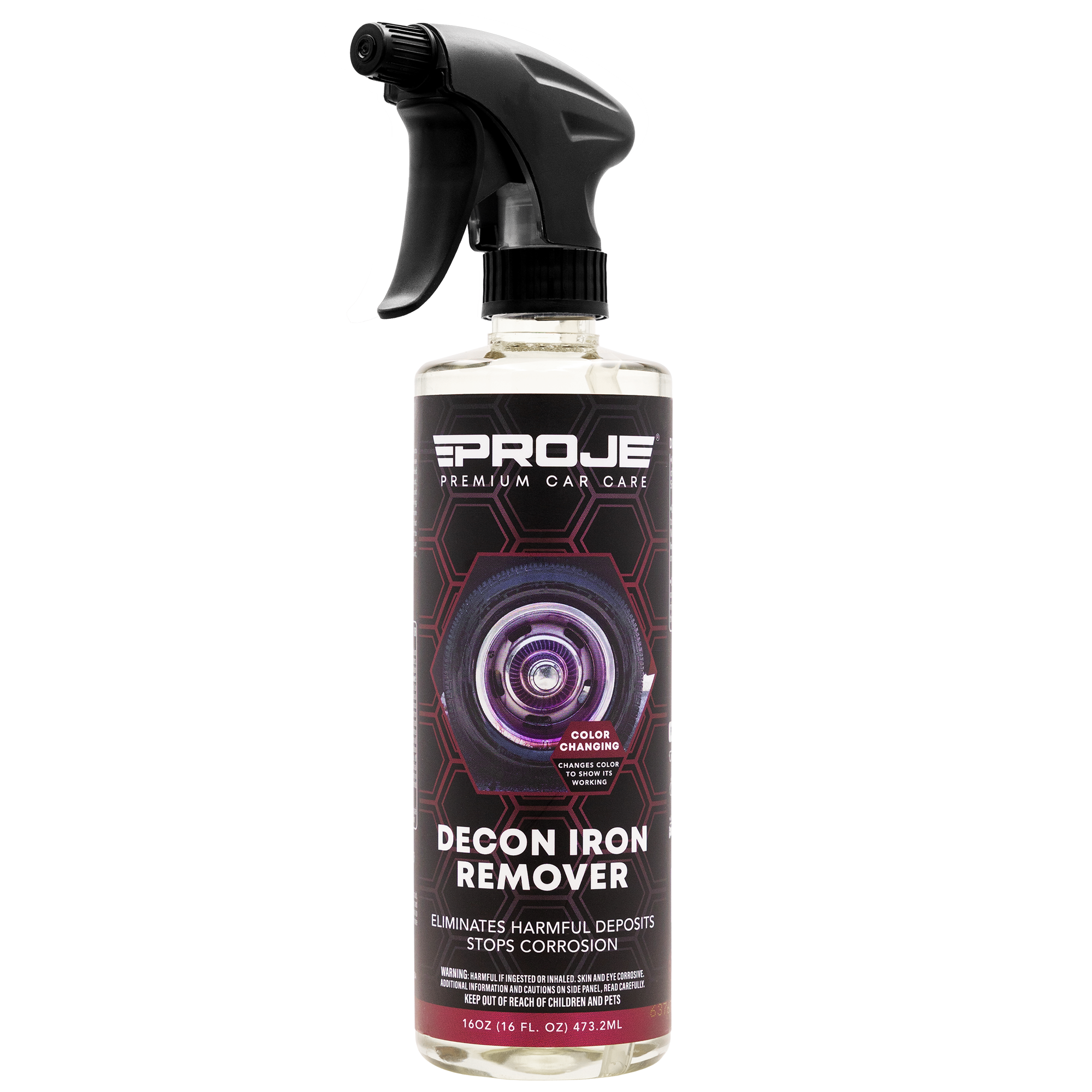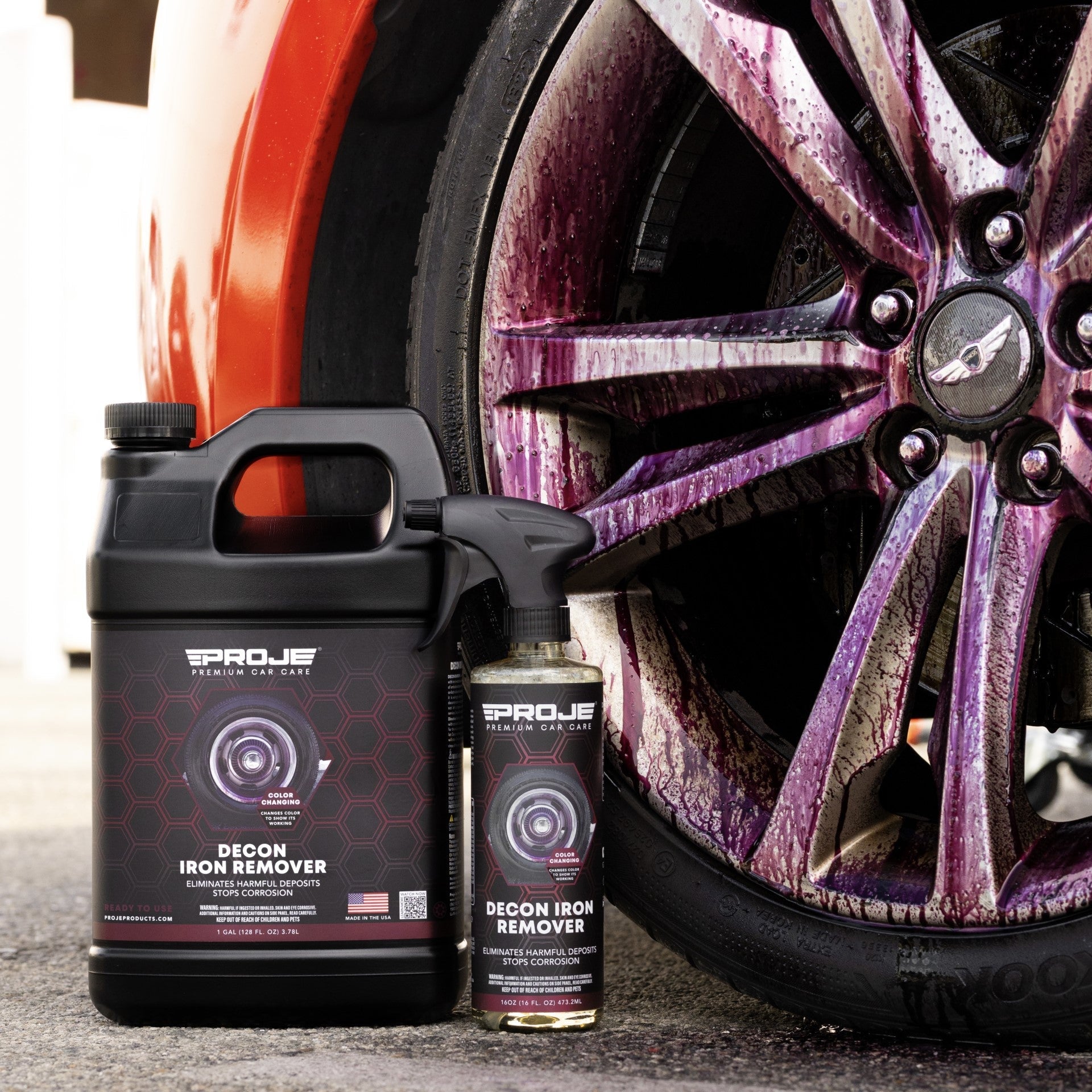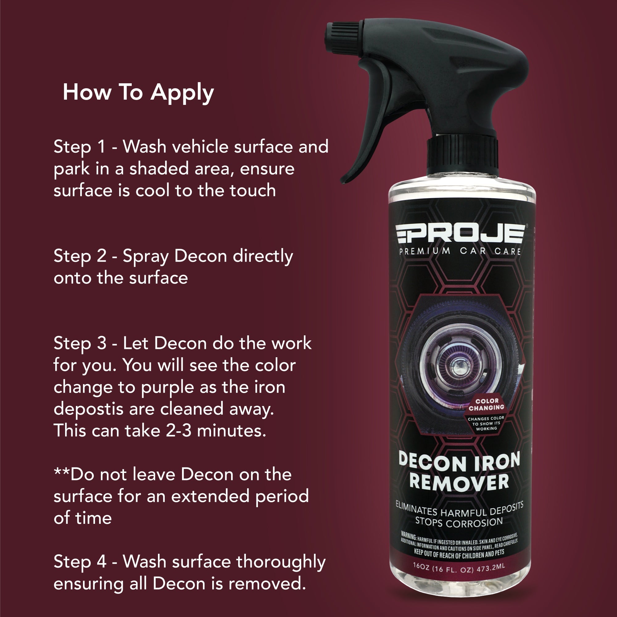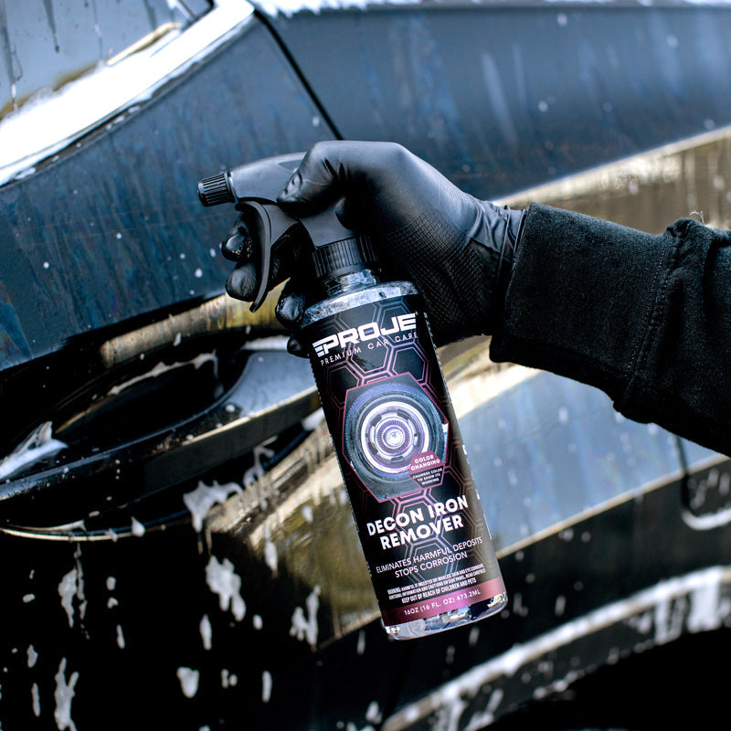 Proje’s Decon Iron Remover is specially formulated to eliminate embedded and bonded iron build-ups from brake dust and industrial fallout from all your exterior surfaces. It works on both visible and hard to see deposit build-ups. The color changing formula lets you know when it’s finished by turning a deep purple after a few seconds of being applied. This allows for more effective decontamination, ensuring that painted and metallic surfaces aren’t left to corrode even after regular detailing services. A deeper and darker purple signifies a high level of contamination on the surface. Work in a Shaded Area - Park your vehicle in a shaded area ensuring the exterior surfaces are clean and cool to the touch.