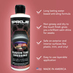 SAFE ON ALL INTERIOR AND EXTERIOR SURFACES - Fusion Tire Dressing is a water-based formula which makes it biodegradable and safe on exterior & interior rubber, plastic, vinyl, and trim.