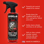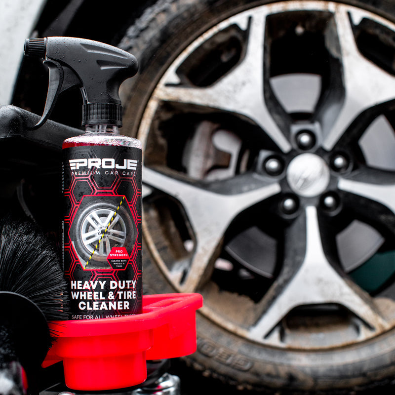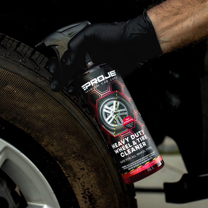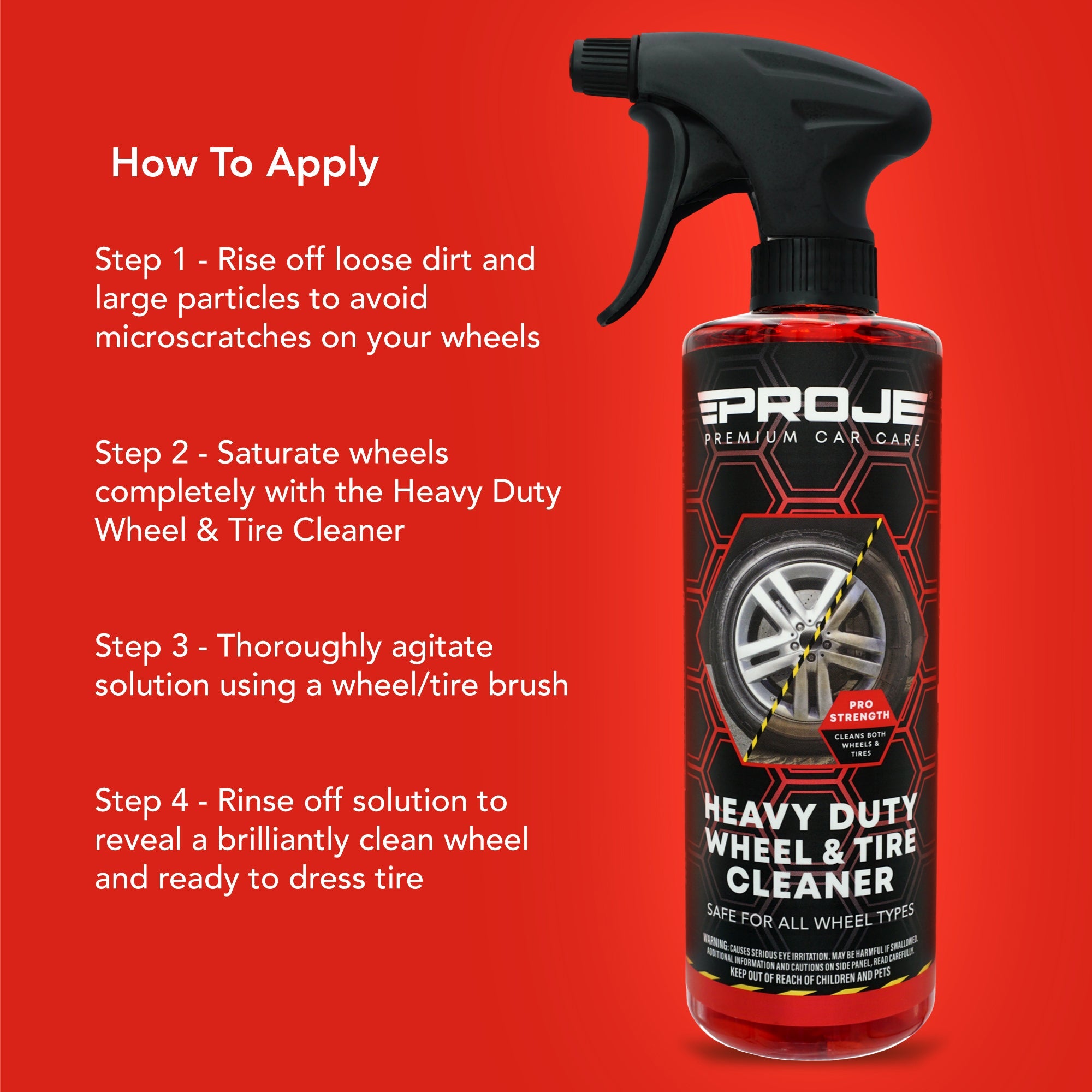 The Heavy-Duty Wheel & Tire Cleaner is a powerful formula designed to penetrate deep into your wheels, effectively breaking down the toughest build-ups of dirt, grease, and contamination caused by the breakdown of surrounding metals at high temperatures. This heavy-duty cleaner is not only safe and versatile, but it also delivers exceptional performance that you can rely on. It's specifically formulated to be safe on most wheel types, ensuring that your wheels maintain their shine without the risk of damage. Whether you're tackling everyday grime or heavy-duty filth, this cleaner makes wheel maintenance effortless and efficient.Rinse - If your wheels are heavily soiled, rinse off the wheels and tires to remove any large chunks of dirt and debris.
