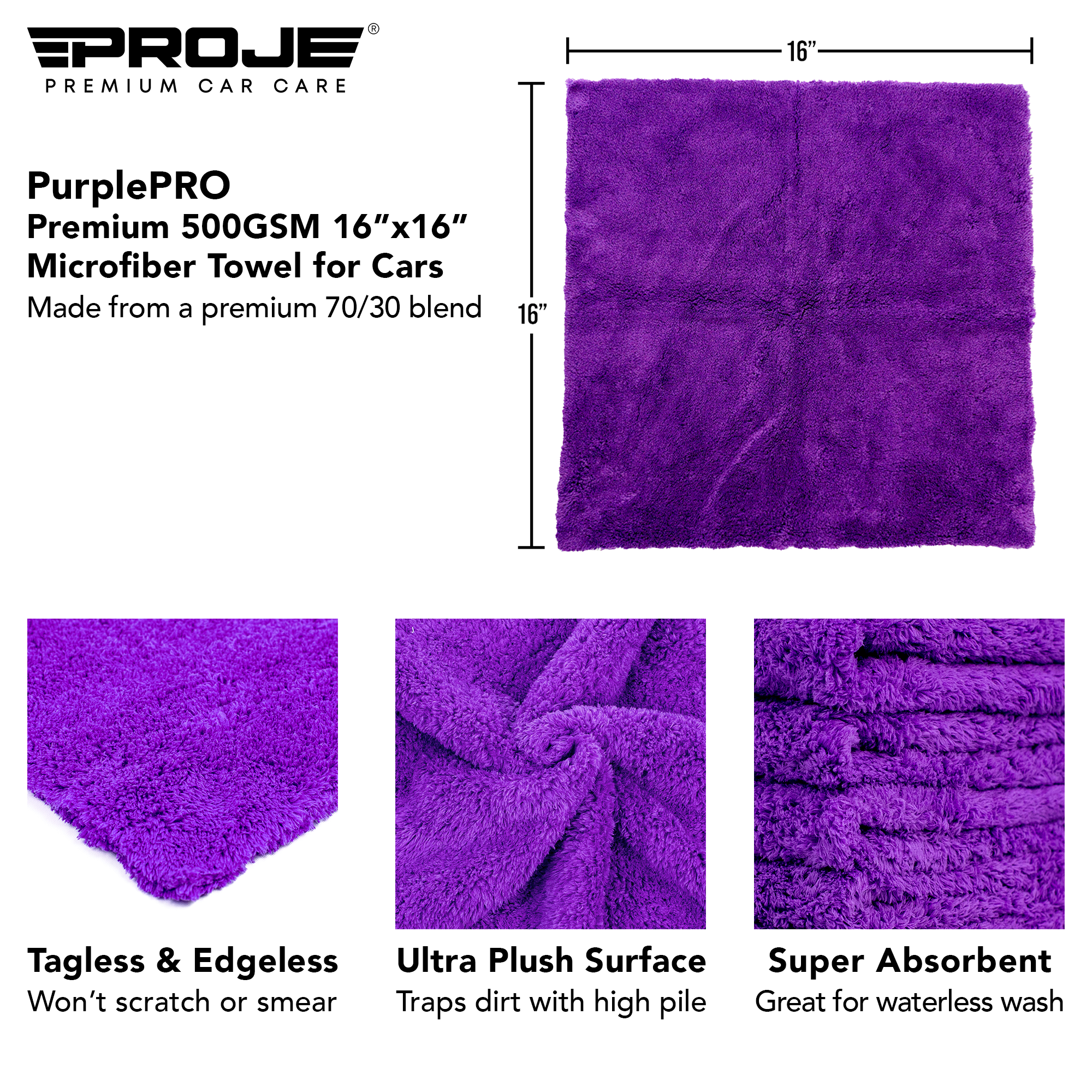 Proje’s professional grade plush microfiber towels are edgeless, tagless, and rated at a premium 500 GSM (Grams Per Square Meter). The ultra-soft and long pile non-abrasive microfiber cloths are great for cleaning windows, glass, mirrors, chrome, and screen. The super absorbent, thick, heavy-duty, durable, and scratch-free material quickly and easily removes the residues of detailing sprays, waxes, compounds, and sealants. Magically lifts dust, dirt, and grime without leaving streak marks when using a Proje quick detailer. Recommend washing separately on delicate and tumble dry low or air dry. Multiple colors available.