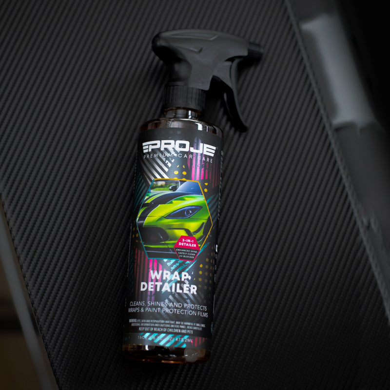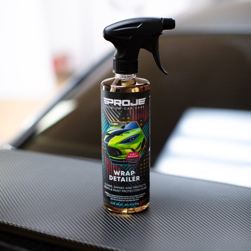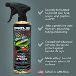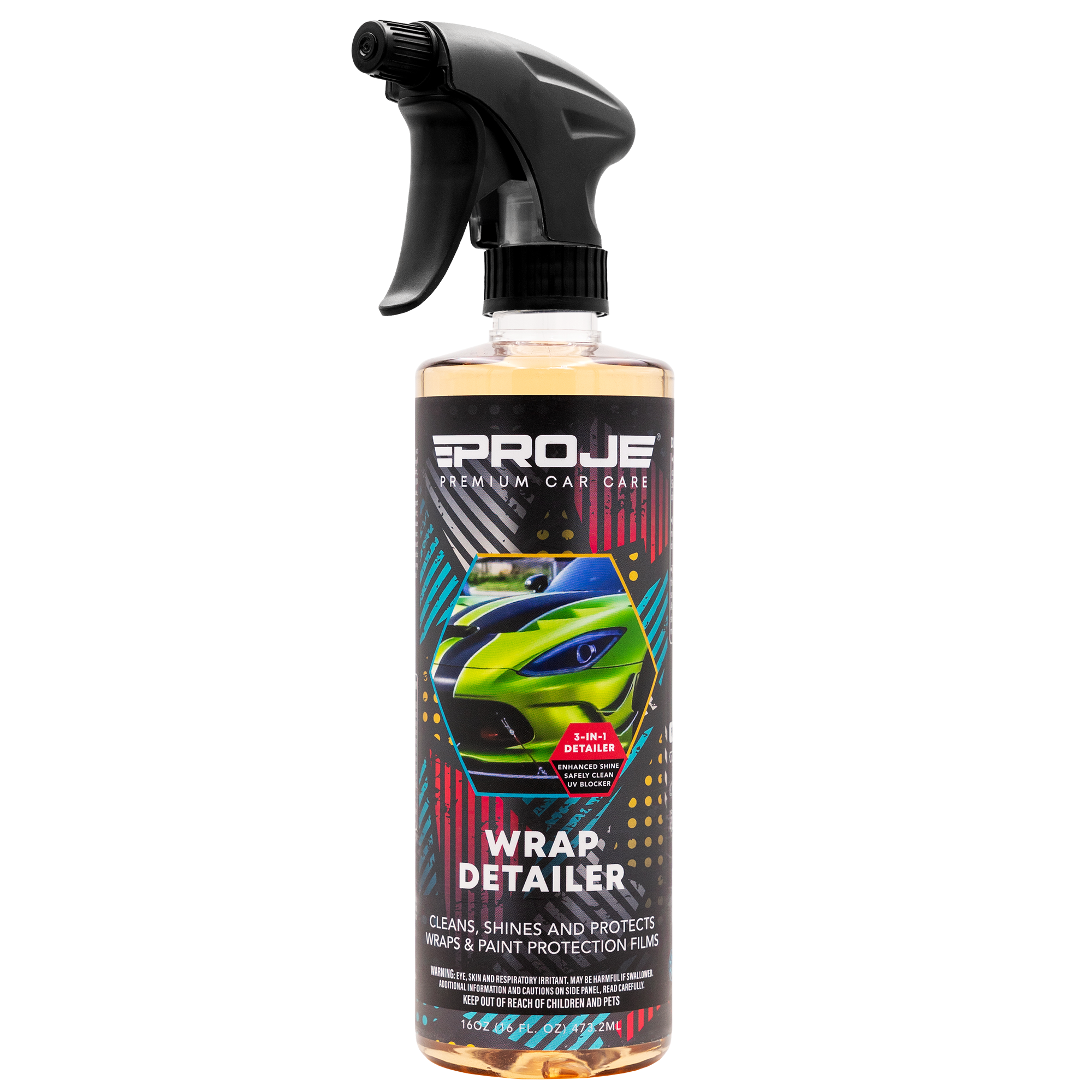 The Wrap Detailer protects your vehicle wrap by safely removing dirt and debris without scratching or peeling. Acting as both a cleaner and a protective spray, it removes dirt while simultaneously adding an extra layer of defense. Its unique formula seals your wrap, shielding it from harmful UV rays and significantly extending its life. This specialized product is explicitly designed to safeguard clear bras, glosses, wraps, and graphics from dirt, scratching, fading, peeling, and harmful UV rays. With regular use, it helps maintain the vibrant appearance of your wrap, ensuring your vehicle always looks its best. Plus, it's easy to apply, making it an essential addition to your vehicle care routine.